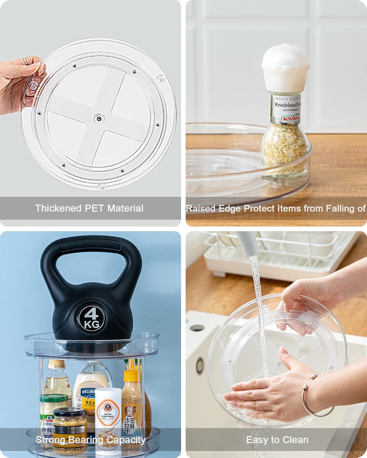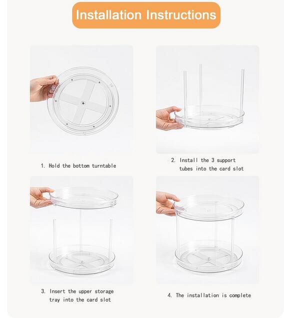 2 tier turntable is shatter-resistant, food safe plastic, which is easy to clean with mild soap and water. Note: do not place in dishwasher. This clear storage bins is an ideal solution for cabinet, kitchen, pantry shelves, bathroom or pantry organization and storage.Easy to install and disassemble. It can be used as a whole (a 2 Tier Lazy Susan) or seprately ( a turntable and a non-rotating storage tray).