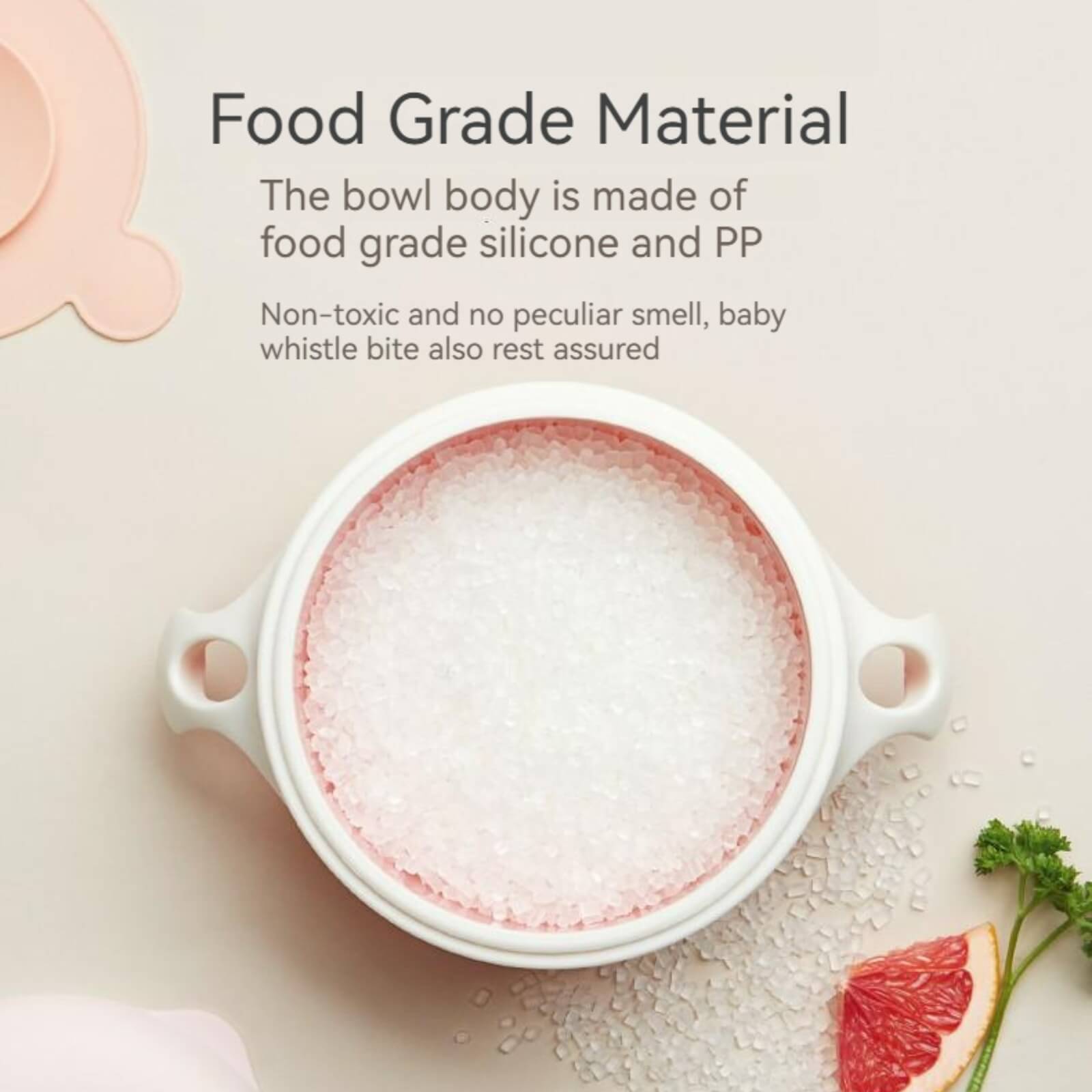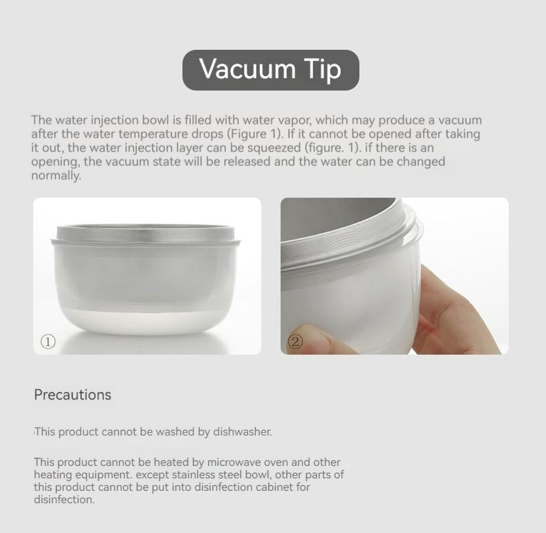 4 Pieces Set: Lid, Stainless steel bowl & handle, Water injection layer, Silicone suction cup