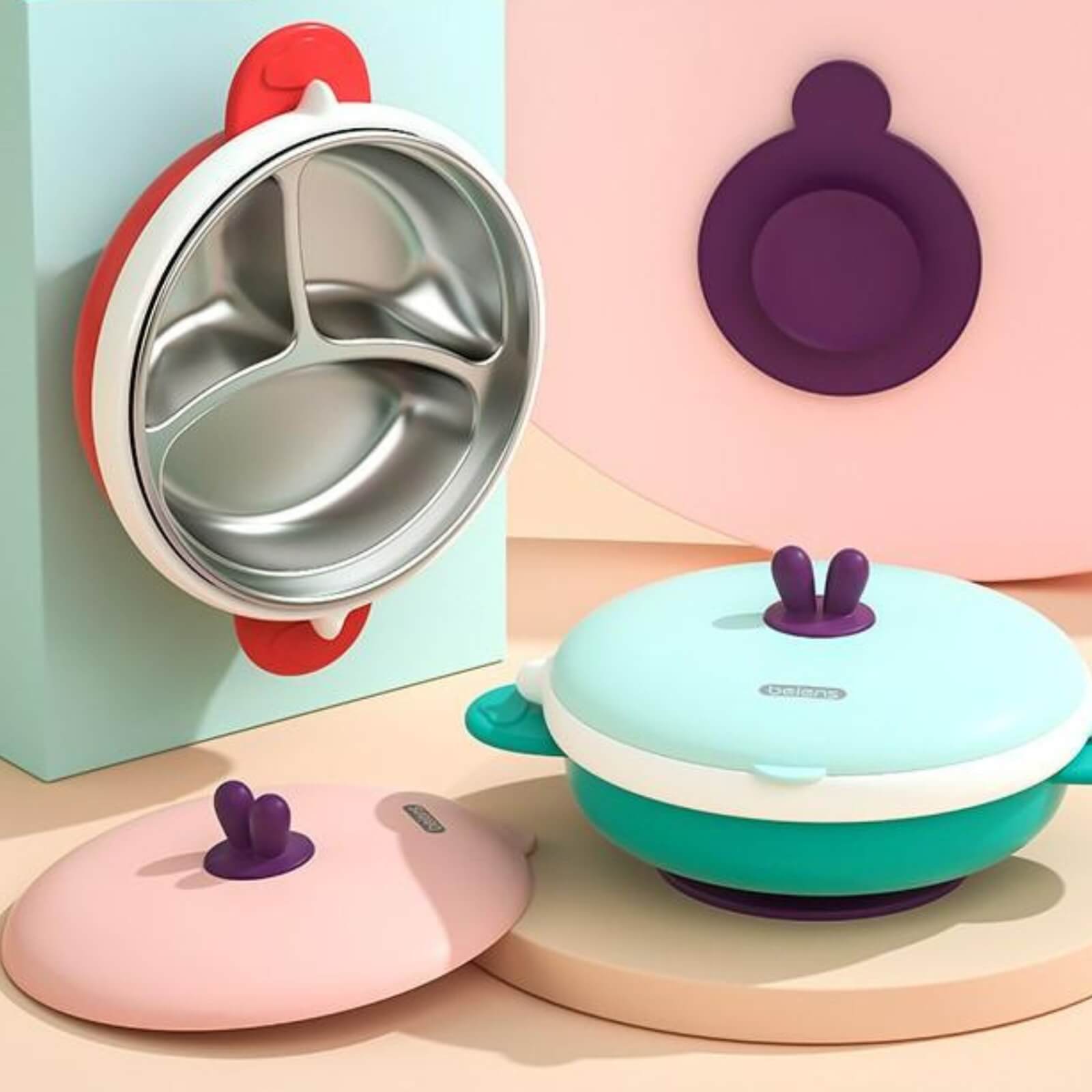 3 Grids Thermal Stainless Steel Baby Toddler Suction Plate /Bowl 4 Pieces Set -Red