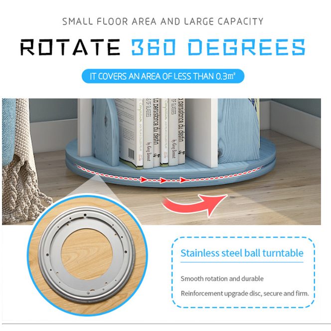 360° Rotating Bookshelf - Our home bookshelf is equipped with a stainless steel ball turntable, allowing it to rotate freely 360°. This practical and convenient design makes it easy to access items from any angle. Additionally, it has a small footprint, covering a small area, which helps save space in your home.