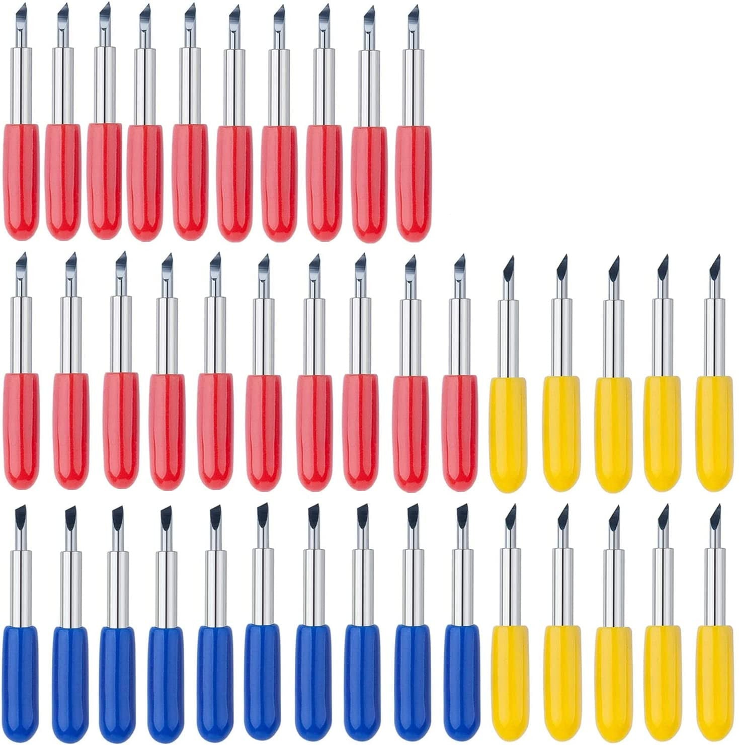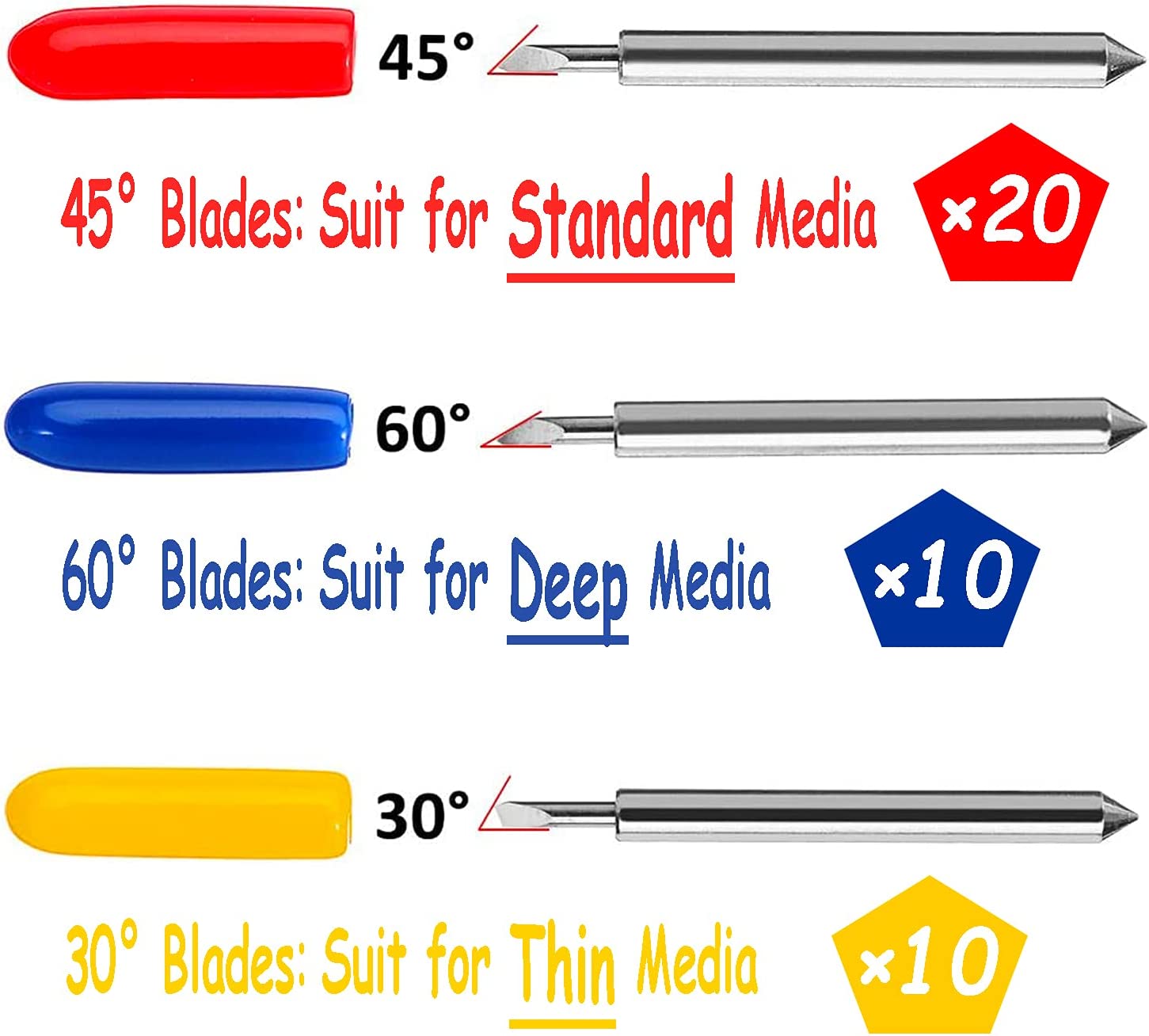 You Get 40pcs Blades for Cricut Cutting Machine: 10 pcs 30° fine point blades (Yellow Cap)+20 pcs 45° standard blades (Red Cap)+10pcs 60° deep cut (Blue Cap).