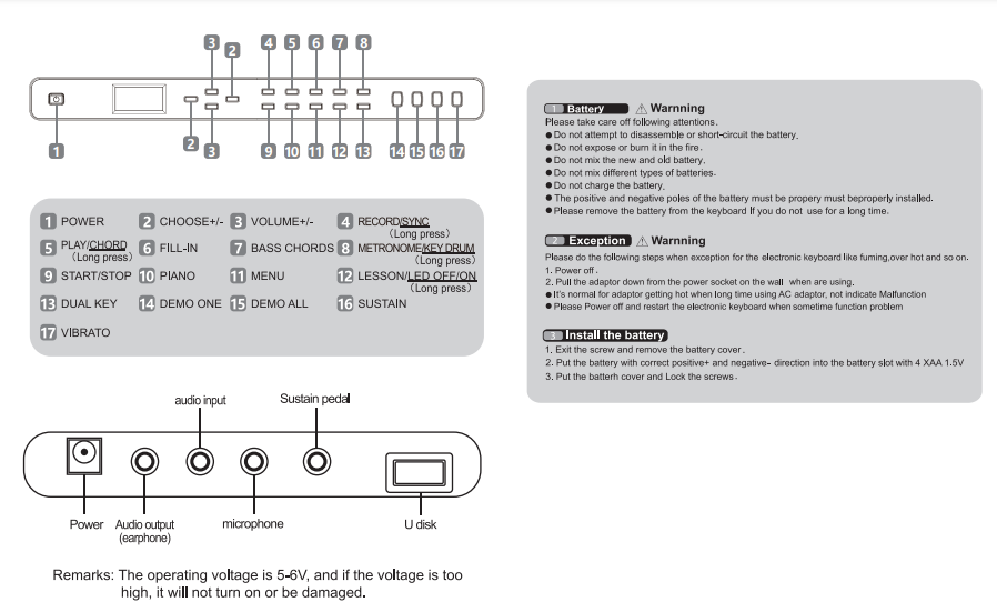 The posilive and negalive poles of the baltery must be propery installed. Please remove the battery from the keyboard lf you do not use for a long time.