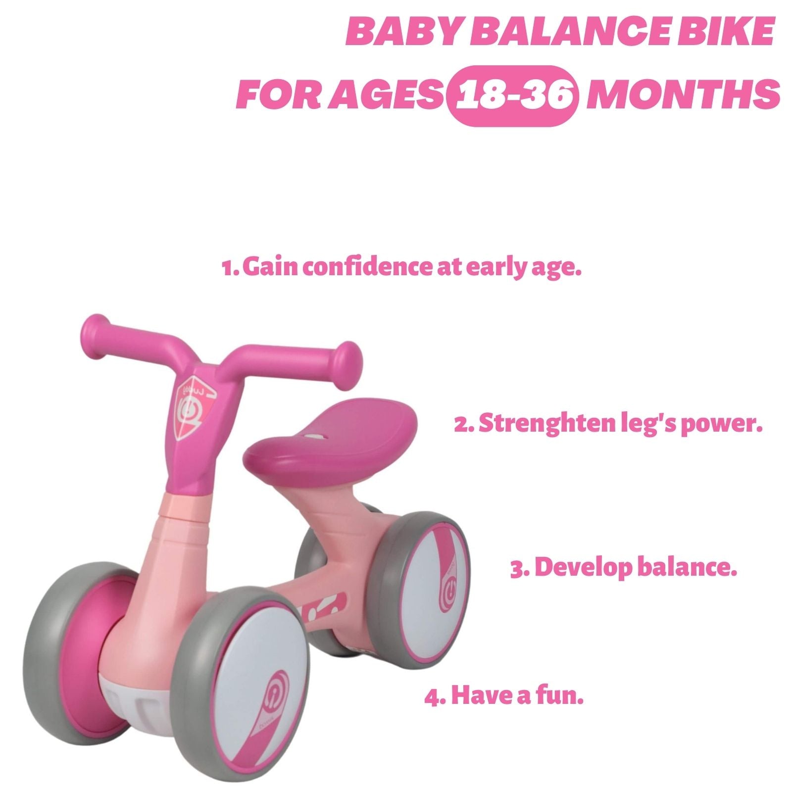 Luddy 1006 Pink is a safe toddler starter balance bike with 4 wheels for babies aged 18-36 months who are learning to walk or developing their balance.