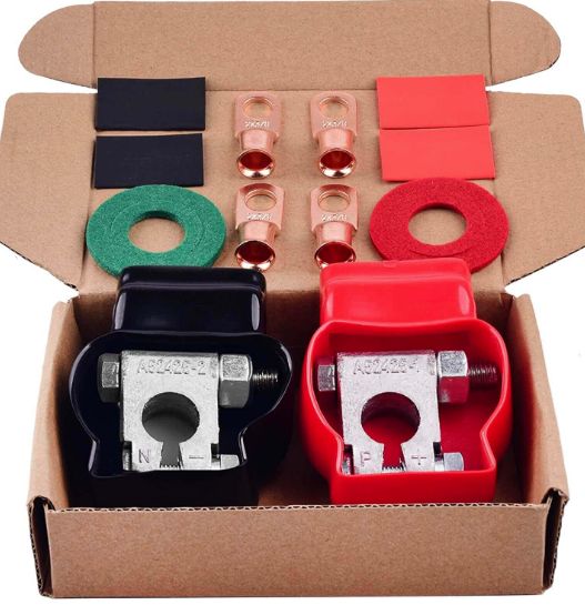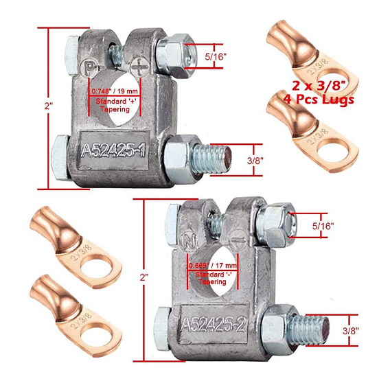 Battery Terminal Connectors, Positive Negative Heavy Duty Auto Car Marine Battery Terminal,with 4 Pcs 2 Gauge 3/8" Copper Lugs,4 Heatshrink,2 Cover and Anti Corrosion Washers (Kit)