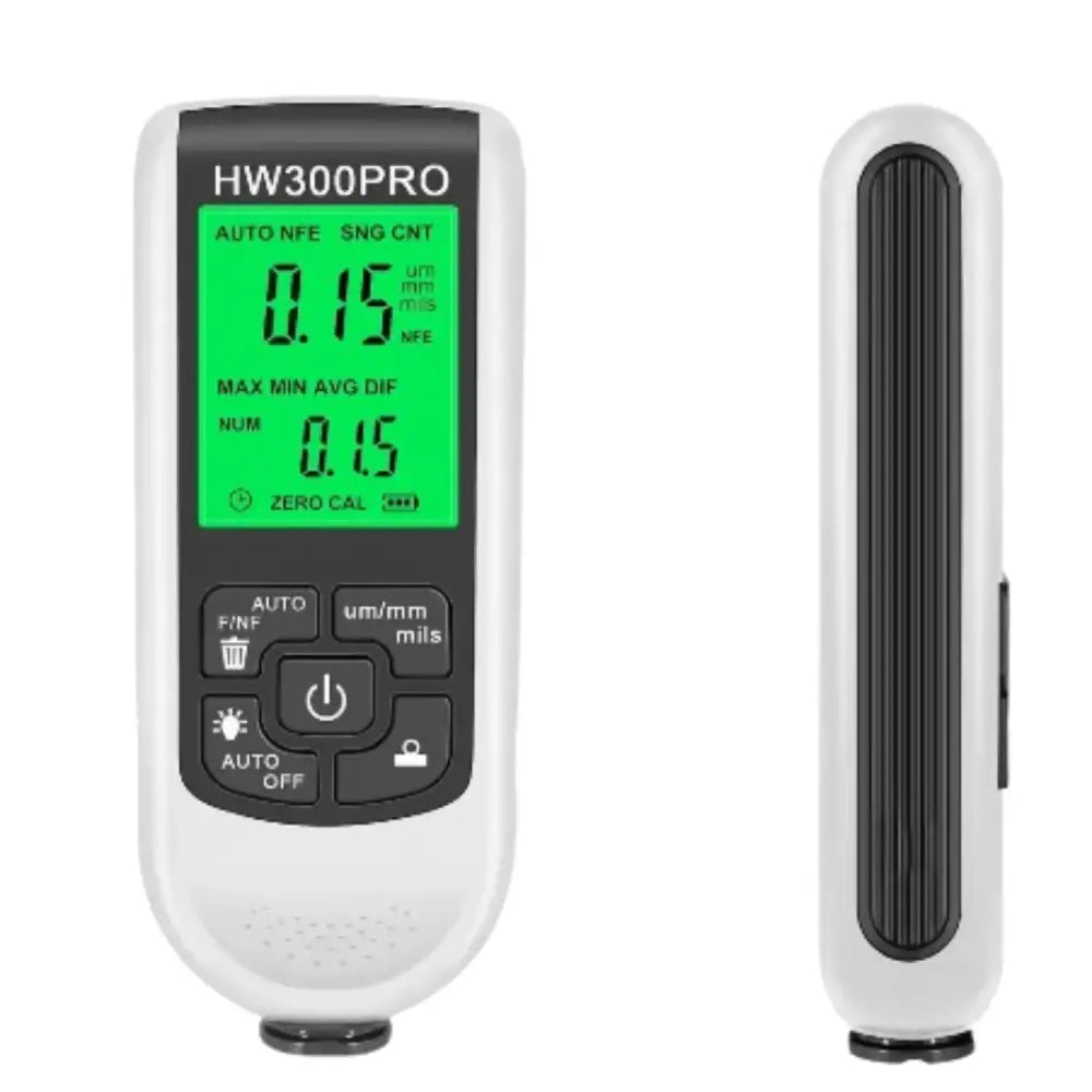 The HW-300PRO Car Paint Thickness Tester is a high-precision digital gauge for non-destructive measurement of coating thickness on various metals.