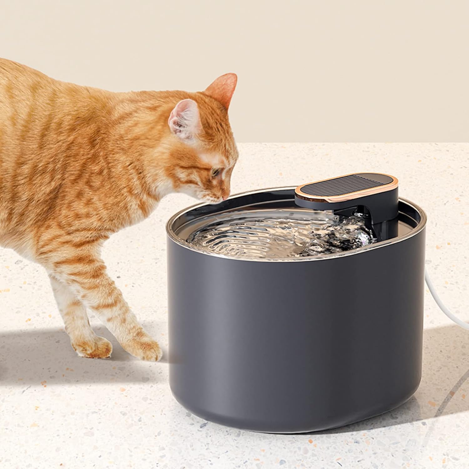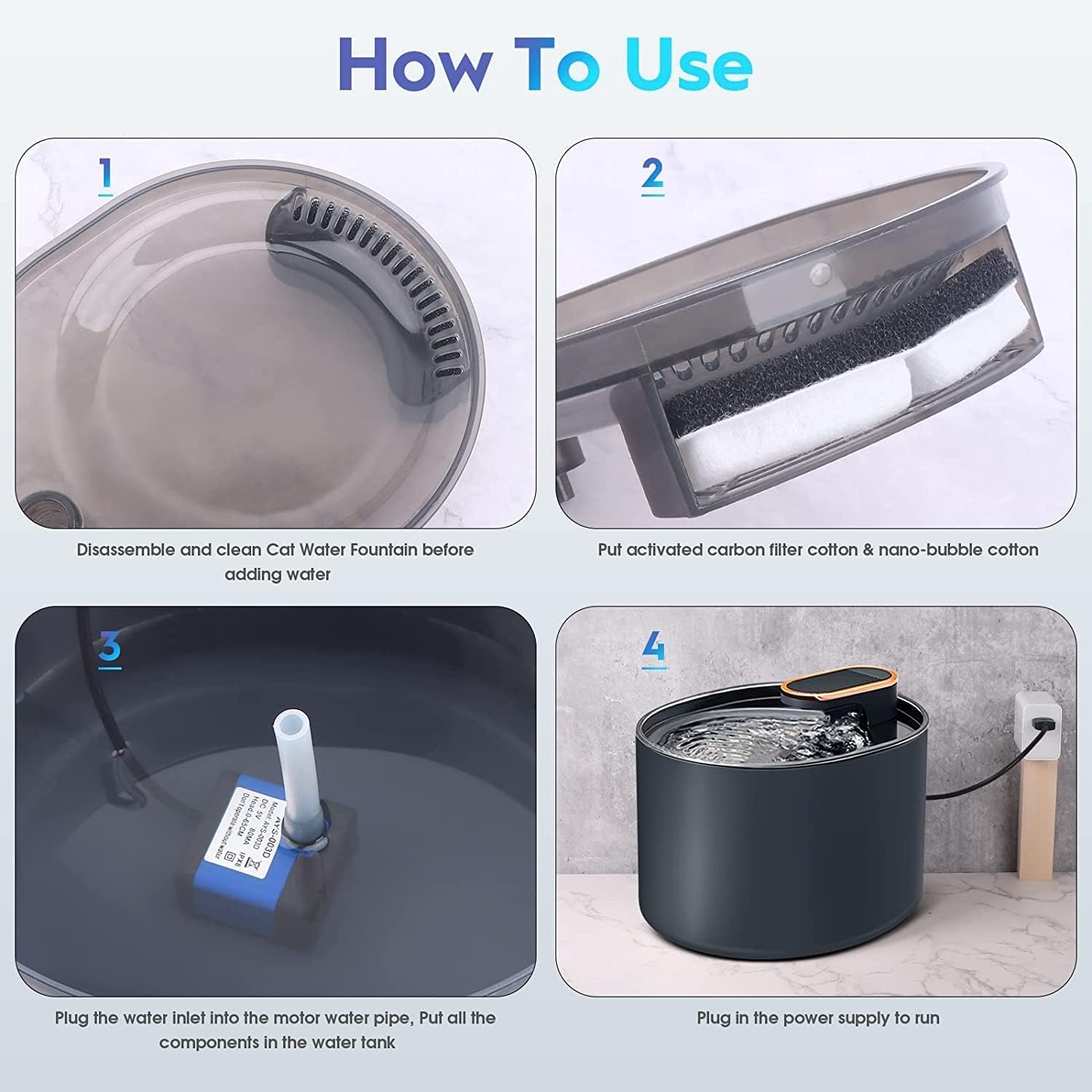 Healthy drinking, happy living As a pet owner, we are committed to finding the best way to take care of pets. It's recommended to add water to two-thirds of the fountain. Please soak the filter for 2 minutes before use. If the new water pump has sound, please continue to operate for 24 hours to optimize.