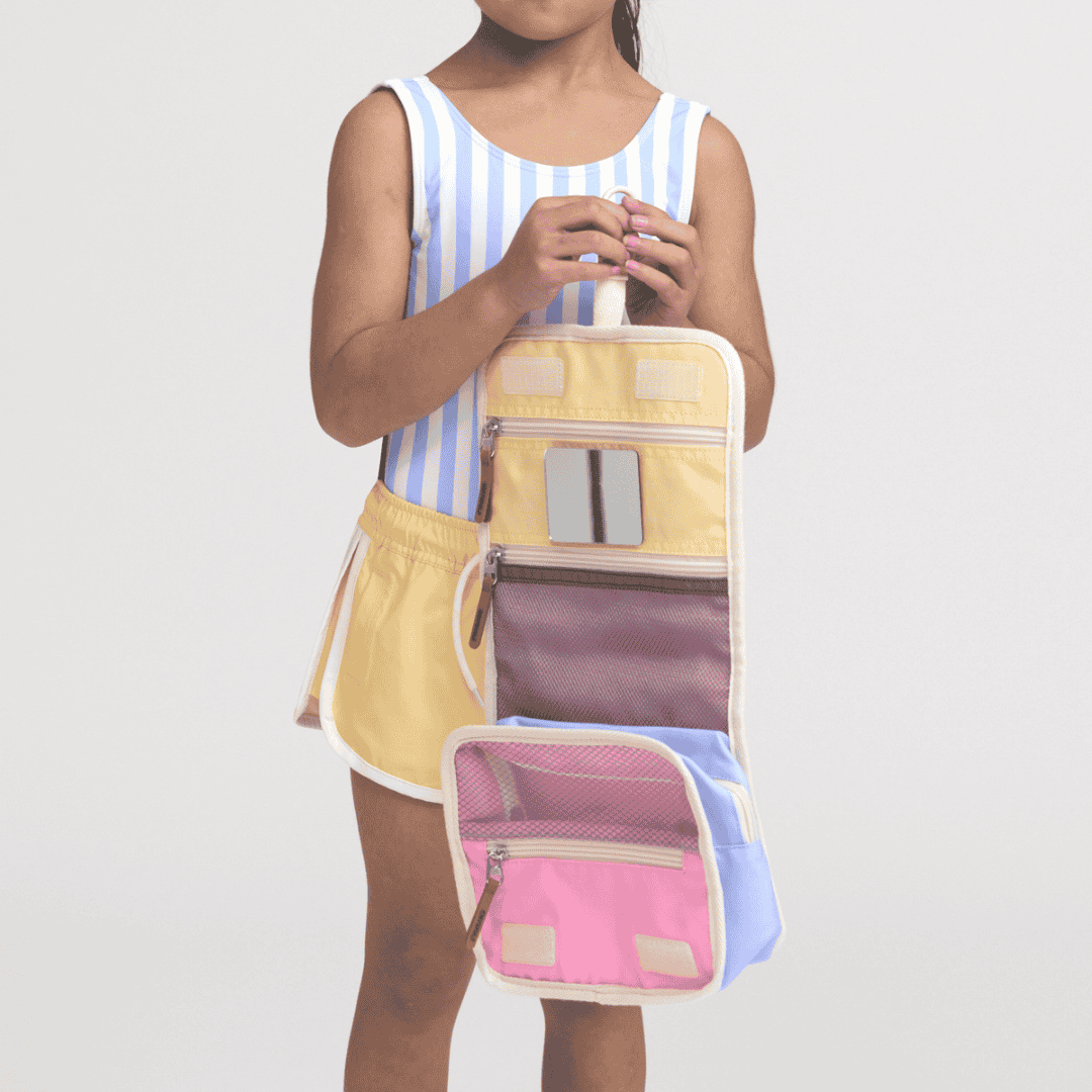 Thoughtfully crafted to keep all their bathroom essentials organised on the go, it features a removable mirror, zippered internal mesh pockets, multiple compartments, and a convenient hanging hook.