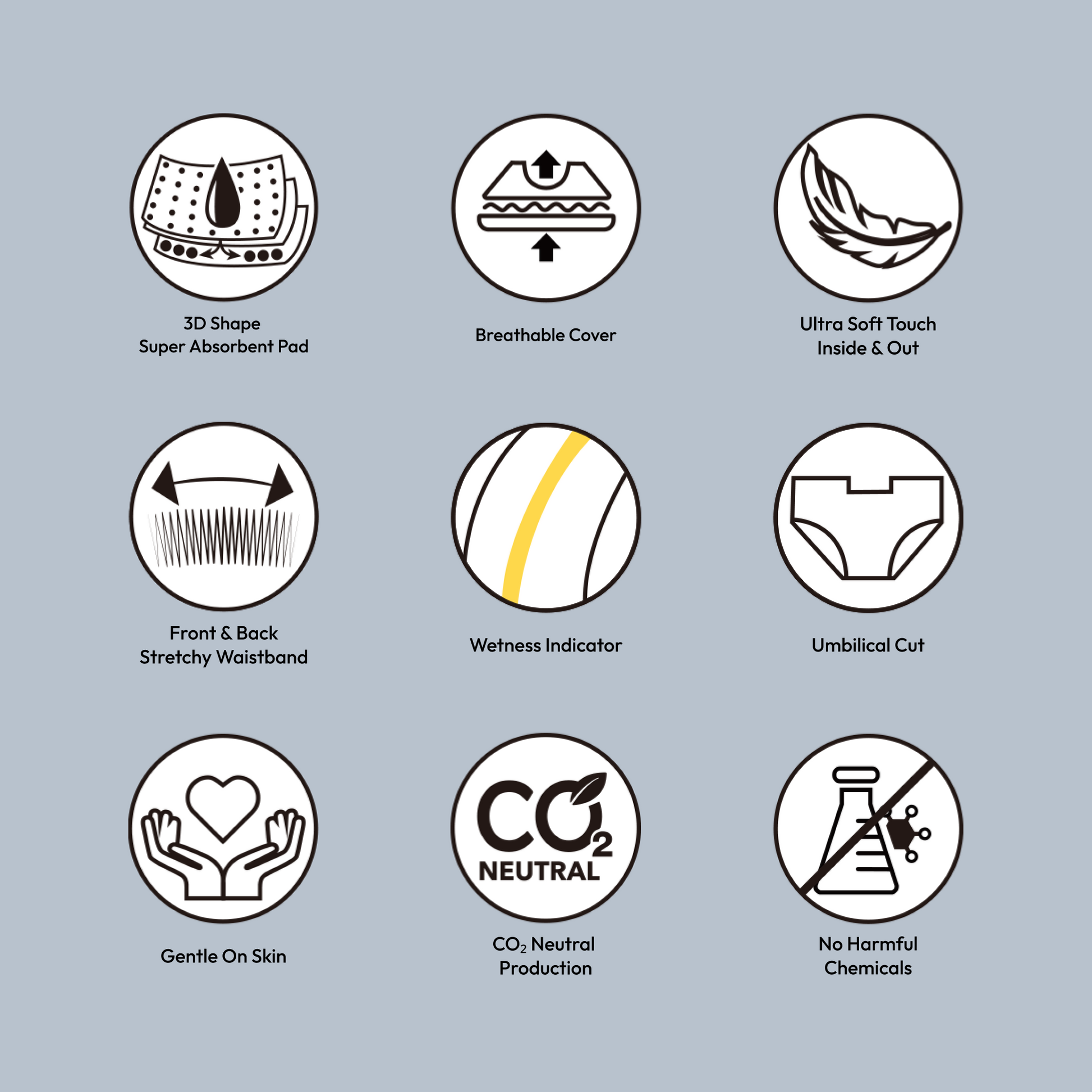 The breathable, soft, and highly absorbent materials ensure the baby's comfort, and the pH-sensitive wetness indicator, leg cuffs, and fastening system offer convenience. Made with a super absorbent 3D core, unique deep pocket, and high back waistband for up to 12-hour leak protection.