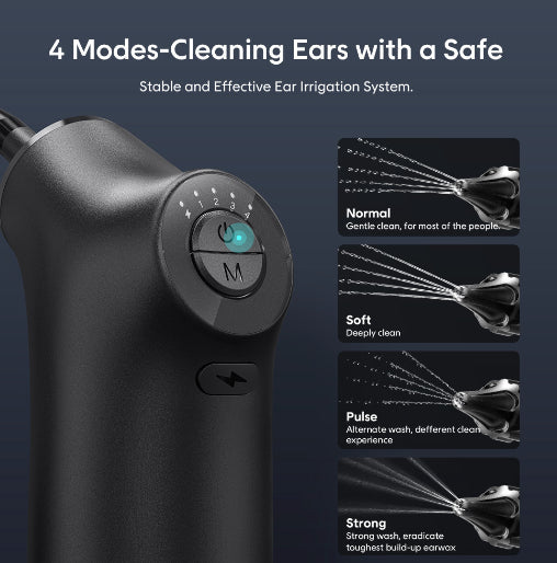 The Four Powers: Electric ear wash kit automatically cleans the ears, 4 water pressure levels that settings range from 7 - 24.5 PSI for choose, normal, soft, plush, strong, choose the most suitable flushing force. Stronger and more effective.