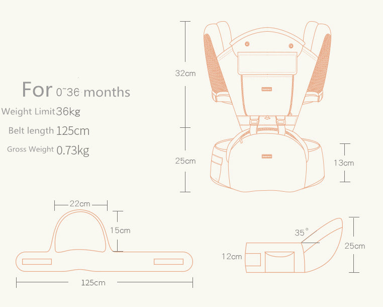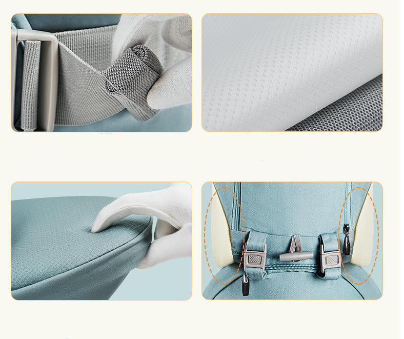 Hip seat / Waist stool carrier is equipped with back support and foldable head support to ensure baby’s smooth breathing, with exceptional lower back comfort with padded lumbar support waist belt.