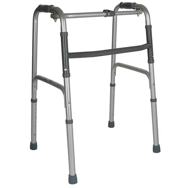 A lightweight Foldable Walking Frame constructed from high tensile Aluminum. Featuring rubber handles and height-adjustable leg extensions fitted with non-slip rubber grip ends for added safety and stability.