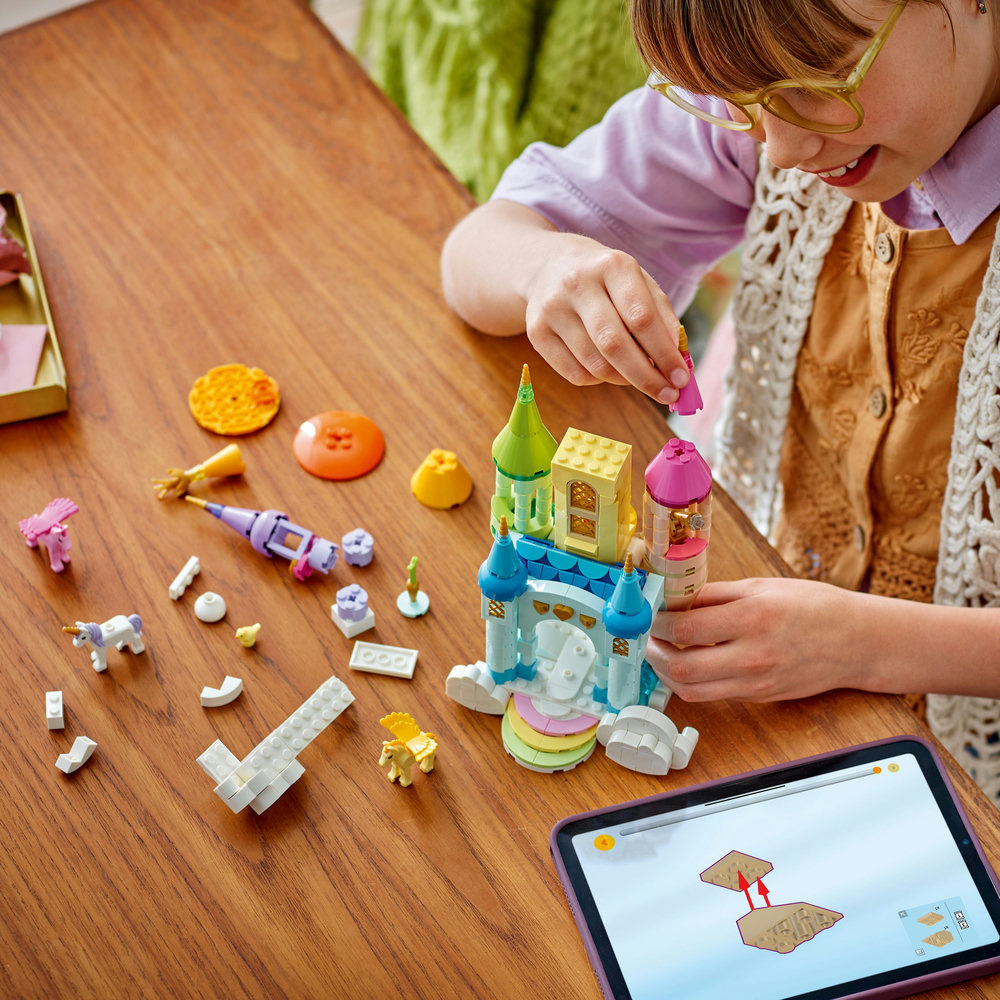 Girls and boys have 3 different LEGO animal playset building options with the same bricks: a castle playset; a unicorn ship model with a rainbow sail; or a playground with a forest cabin, garden and picnic table.