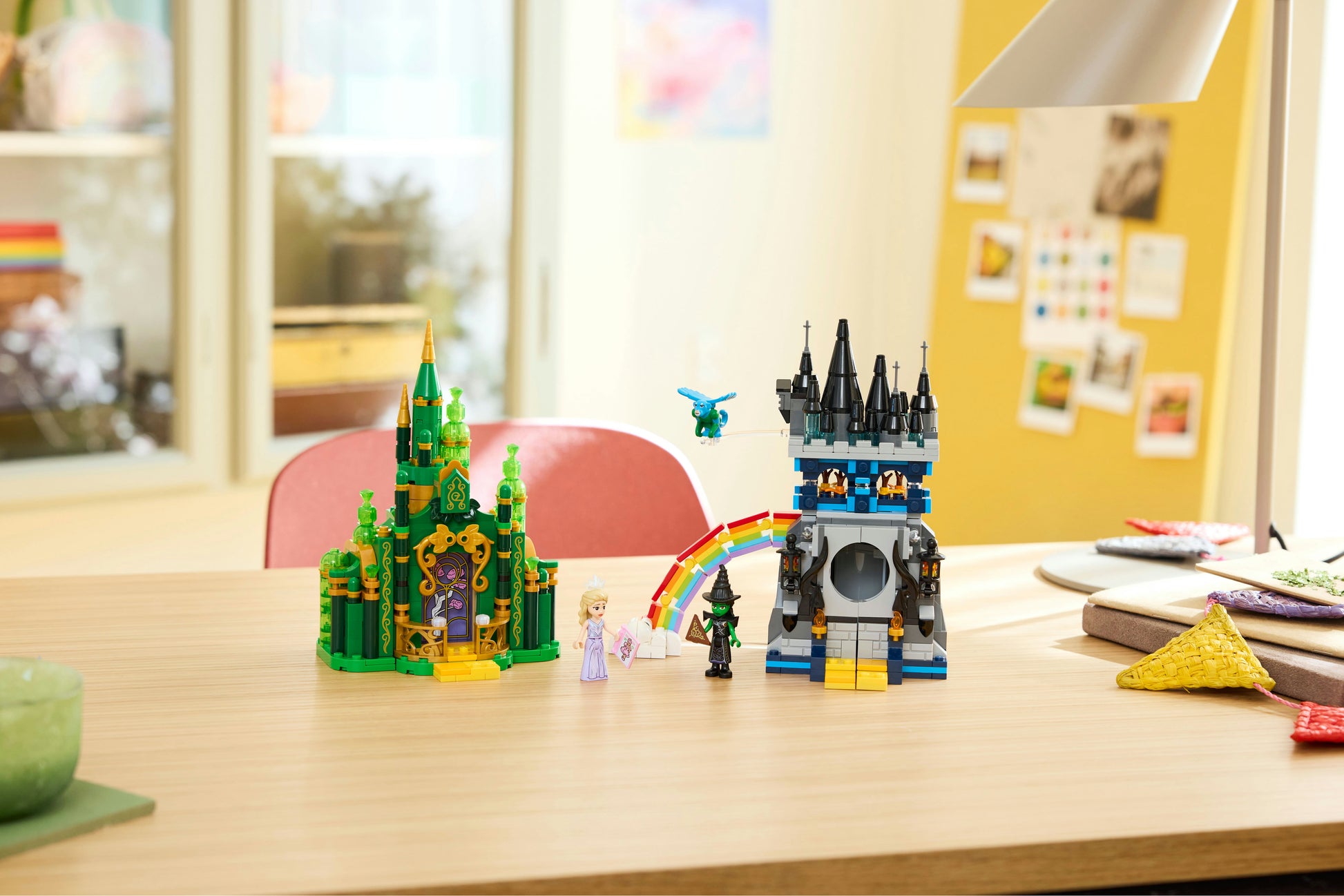 - LEGO® Wicked adventure gift – Emerald City & Kiamo Ko Castle playset includes 2 building toys with LEGO Wicked Elphaba and Glinda minidolls, a flying monkey figure and a buildable rainbow