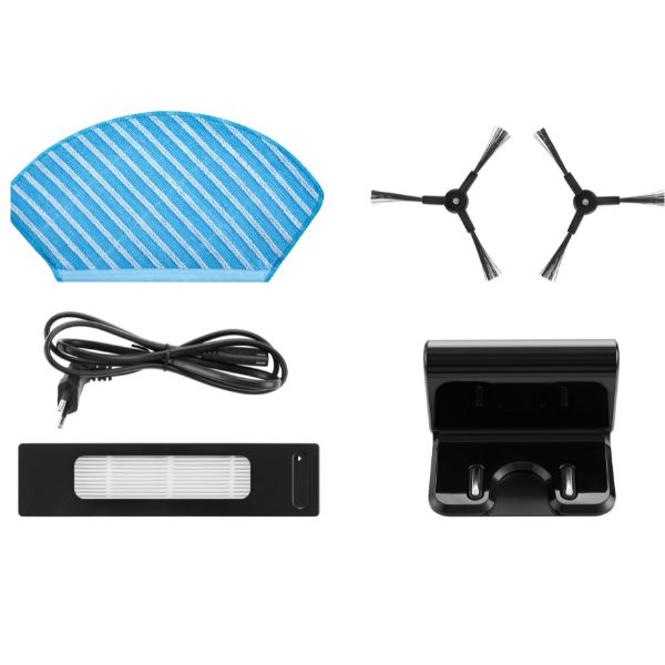 Instruction manual x1; Side brush x2 Pairs; Mop holder x1; Mop Cloth x1; Cleaning brush x1; Charging basex1; Power cable x1; HEPA filter x1;