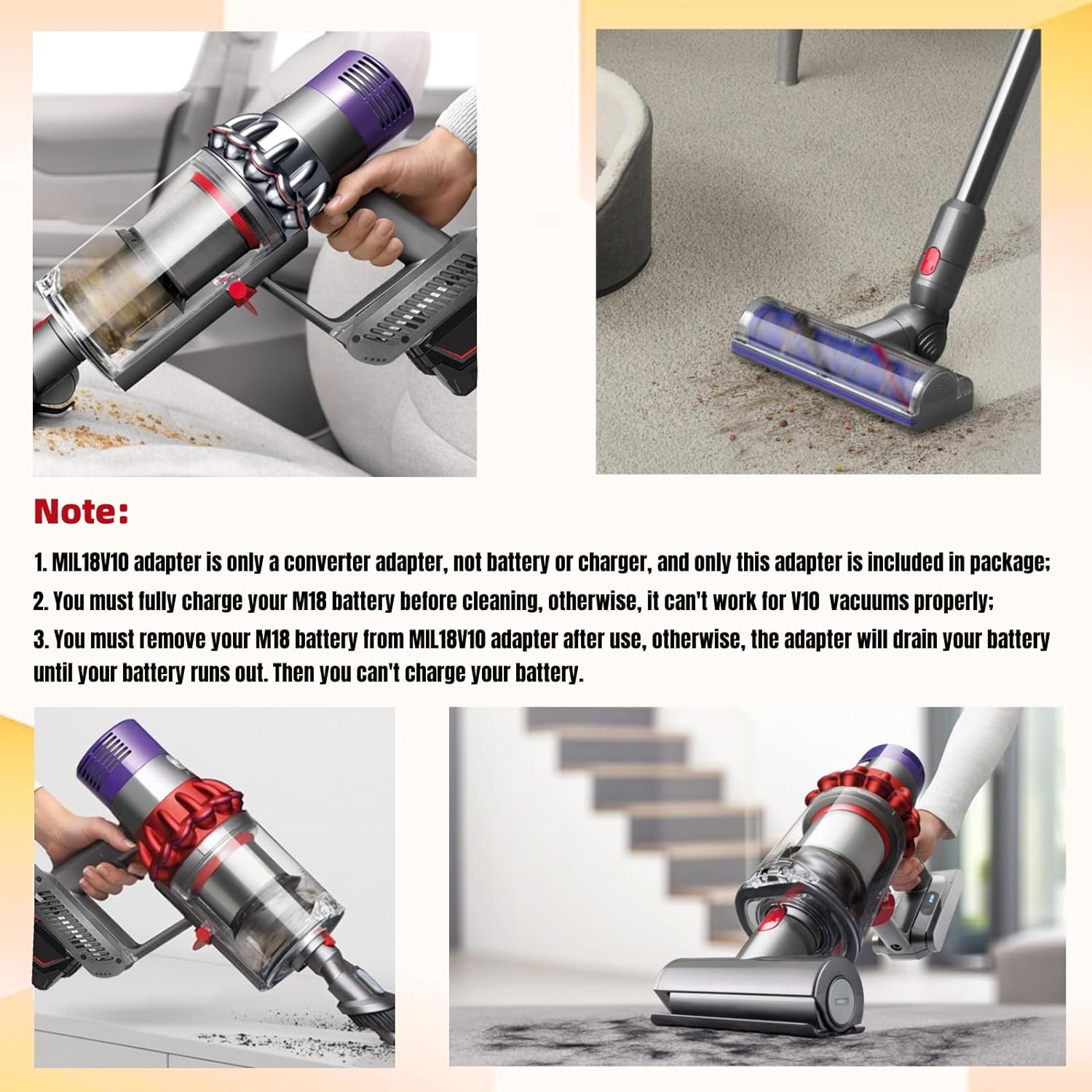 Only compatible with Milwaukee M18 18V Battery: As rated power of V10 vcacuums is very high, you must use 4Ah batteries or above, and fully charge battery before vacuuming.