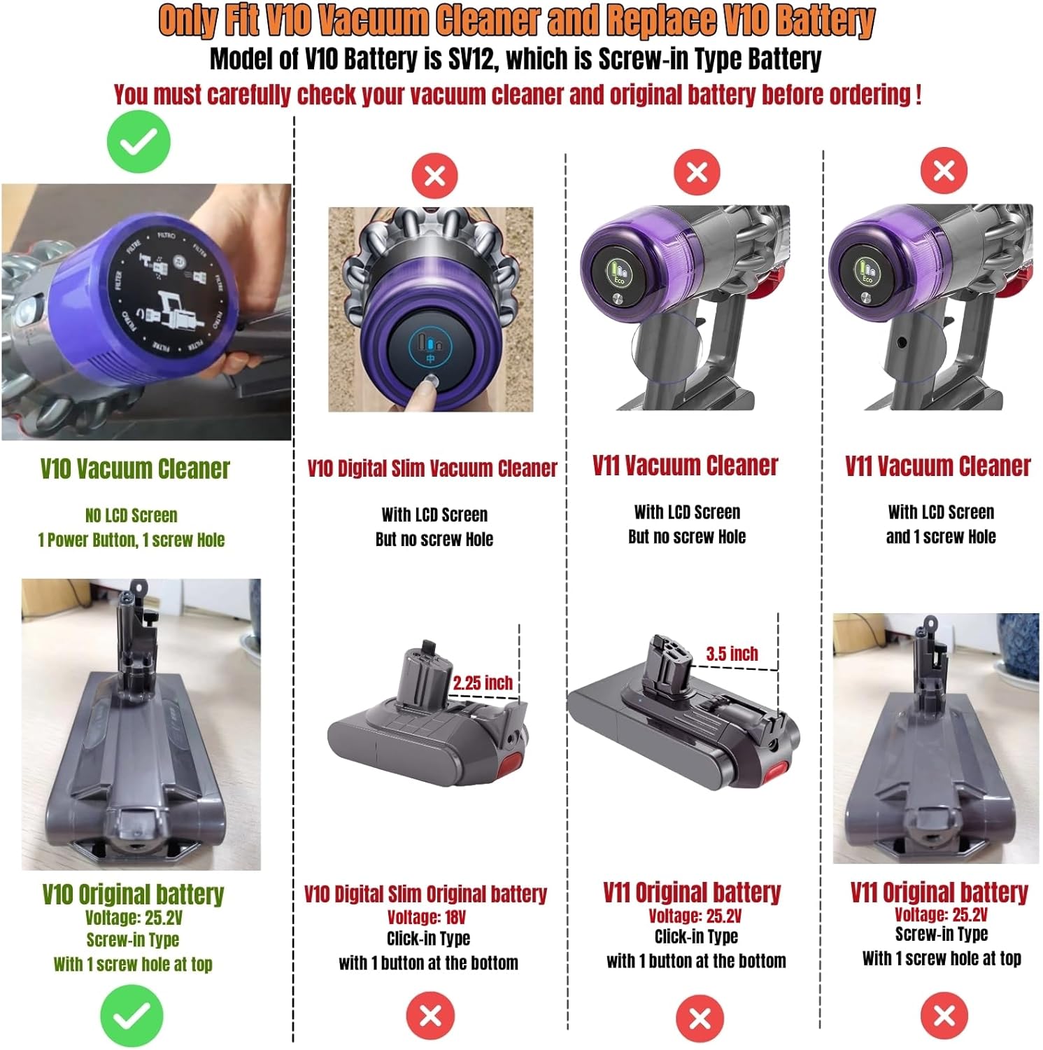Only fit for Dysen V10 Vacuums (screw-in type): but not fit for Dysen V10 digital slim vacuum cleaner, and V6 V7 V8 V11 V12 V15. If you don't know the model of your vacuums and original battery, please check images carefully.