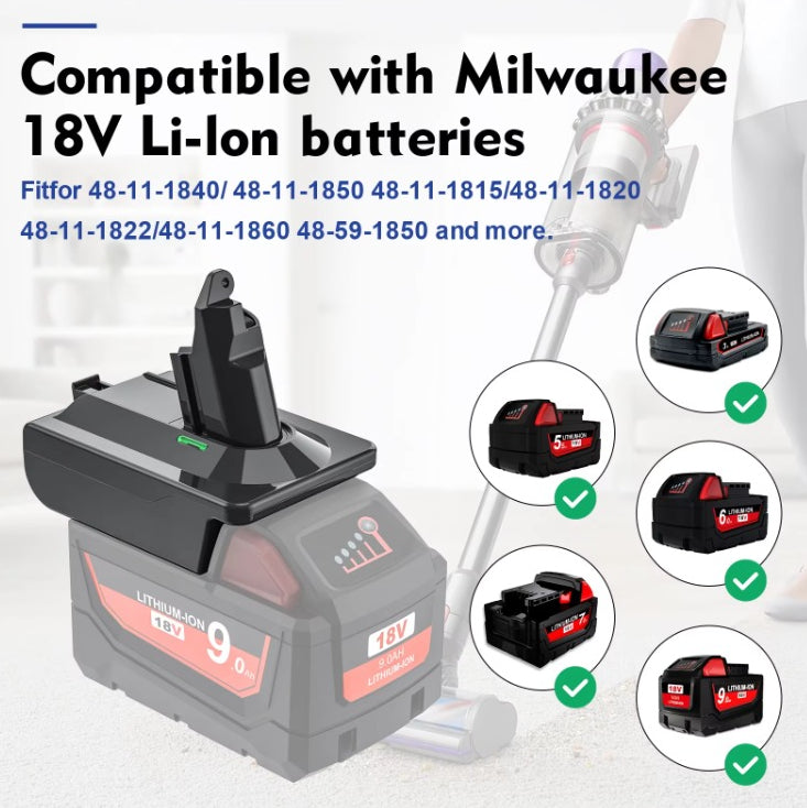 Replace for Milwaukee Batteries to for Dyson V6 series: This V6 Battery Adaptor is comply with FCC RoHS and CE security testing standards. Replace for Milwaukee M18 18V Batteries M18,48-11-1811,48-11-1815,48-11-1820,48-11-1822,48-11-1828,48-11-1840,48-11-1841,48-11-1850,48-11-1852 to for Dyson V6 series SV03 SV04 SV05 SV06 SV07 SV09 DC58 DC59 DC61 DC62 DC72 DC74 vtc4 965874-02 967810-03 967810-02 967810-23