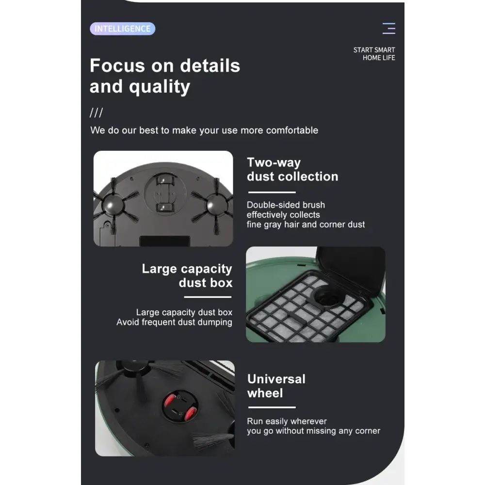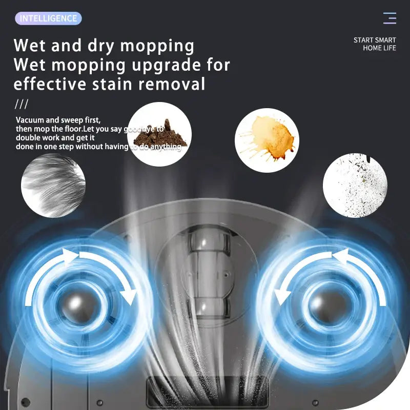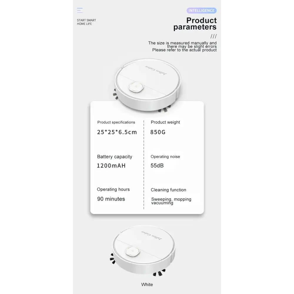 Compact and efficient robot vacuum cleaner designed for sweeping, mopping, and vacuuming.