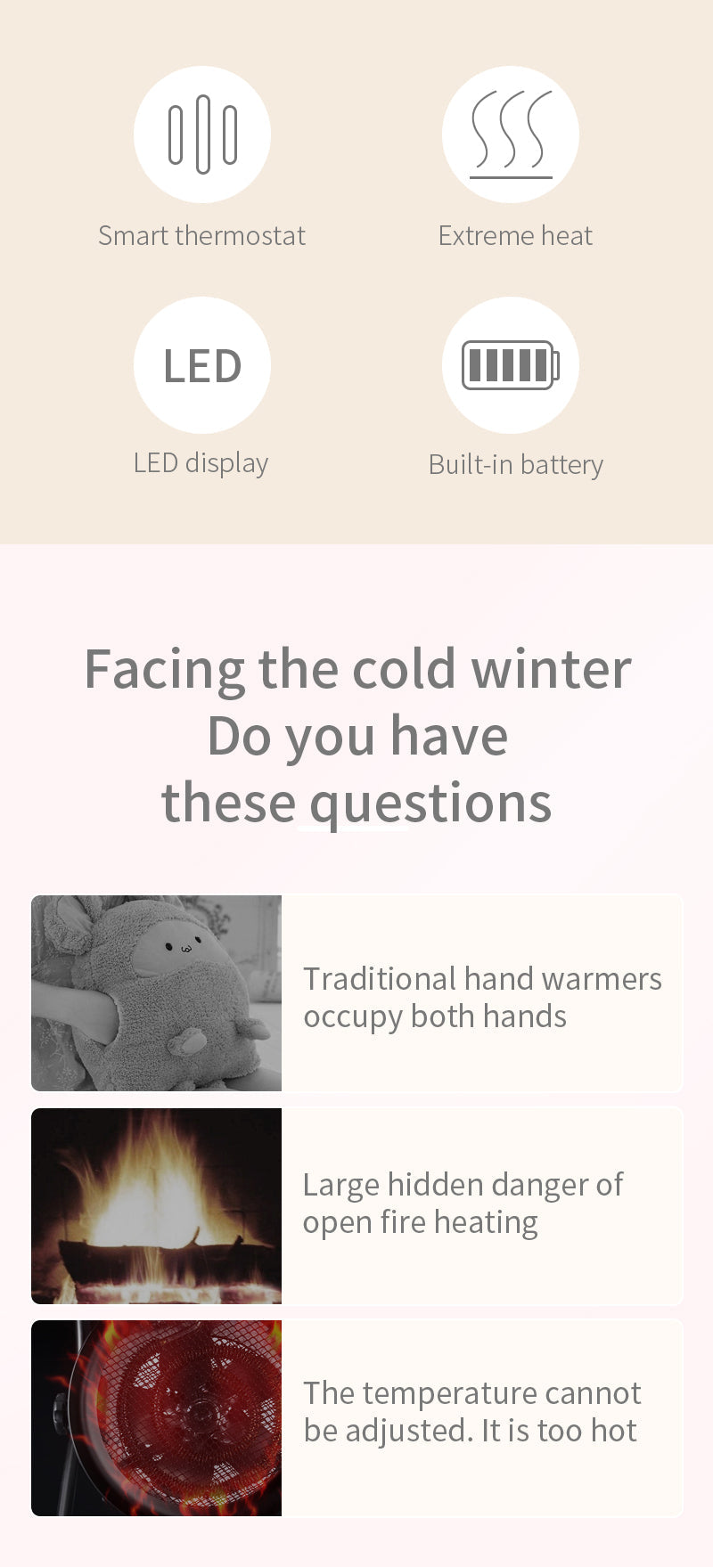 Fast Heating & Adjustable Temperature After long press the switch button to start the heat. It can instantly provide heat for you in seconds, don't wait too long. There are 36-58°C you can freely adjust. The current temperature will be digitally displayed on the left screen.