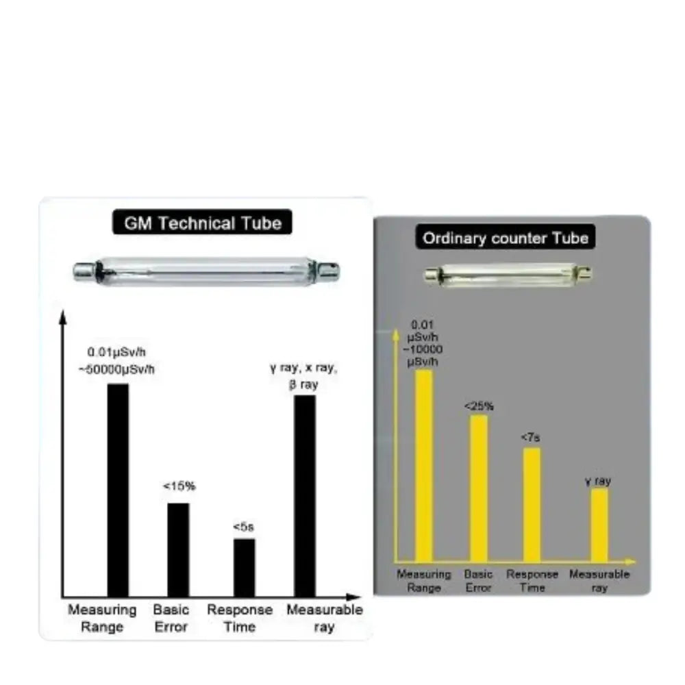 Detects X-ray, γ-ray, and β-ray radiation with high sensitivity Geiger-Muller (GM) tube