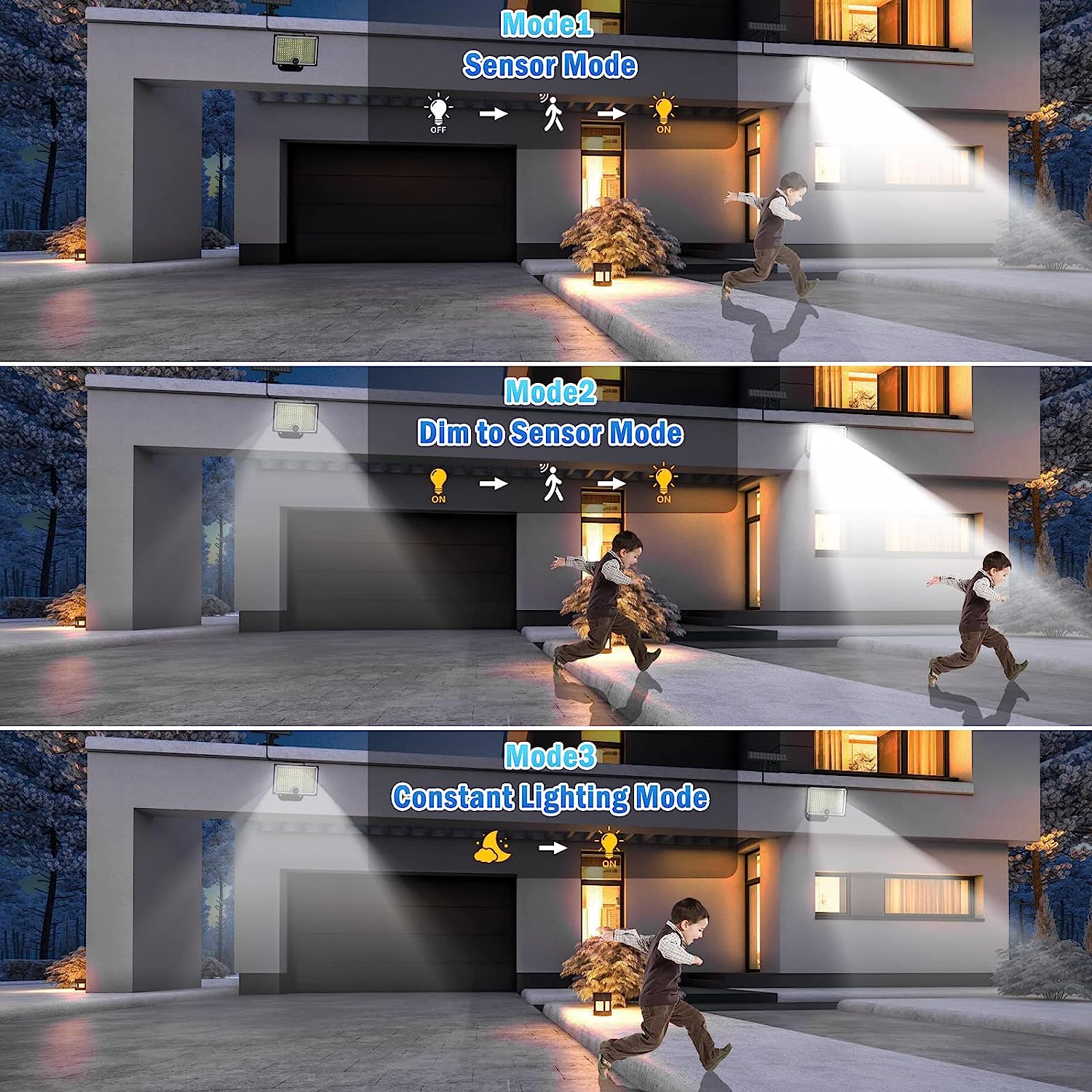 3 Adjustable Lighting Modes: After connecting the solar panel with the LED lamp, the LED lamp is automatically charged during daylight and does not light up. At night, it lights up in the mode you have selected. 1. motion activated mode, 2. dim to sensor mode, 3.constant dim Lighting mode without motion.