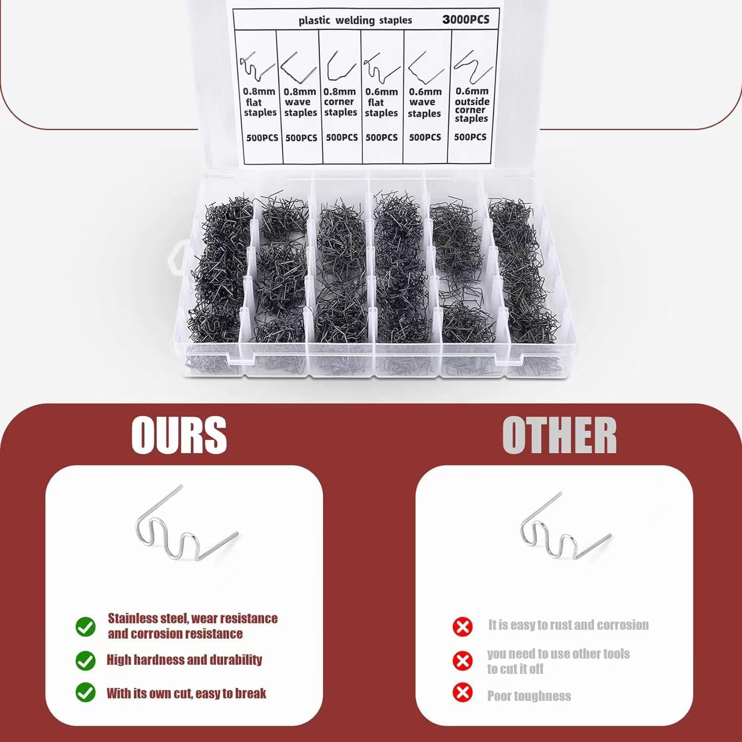 Plastic Welding Staples 3000 pcs, 6 Types Hot Staples for Decoration,Auto Repair, Architectural Modelling,Toy Manufacturing