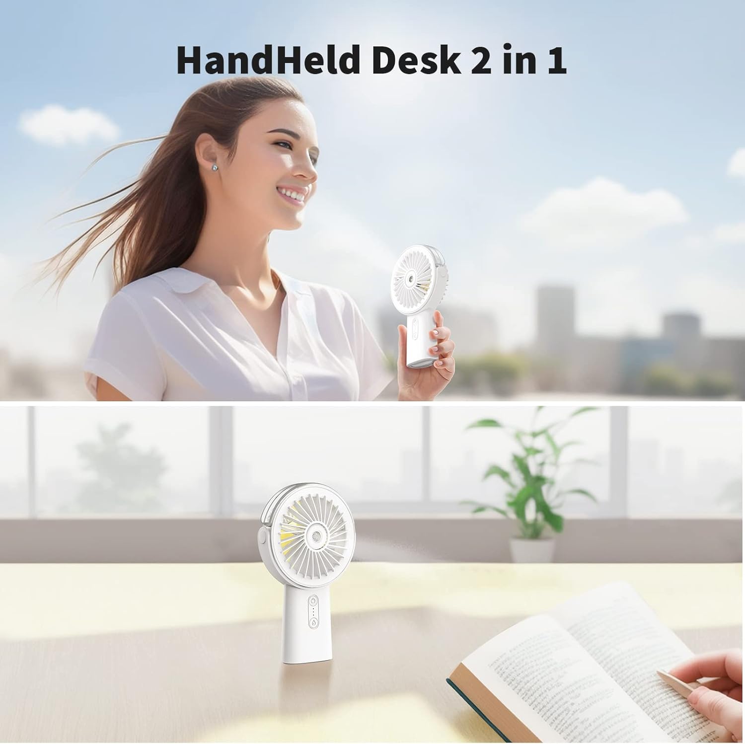 Handheld and Desk 2-IN-1: Thanks to the base design, you can used it as a handheld mister fan when outdoor and a mini desk fan on a flat table in the office. Anti-slip mat at the bottom of the base to keep it stable