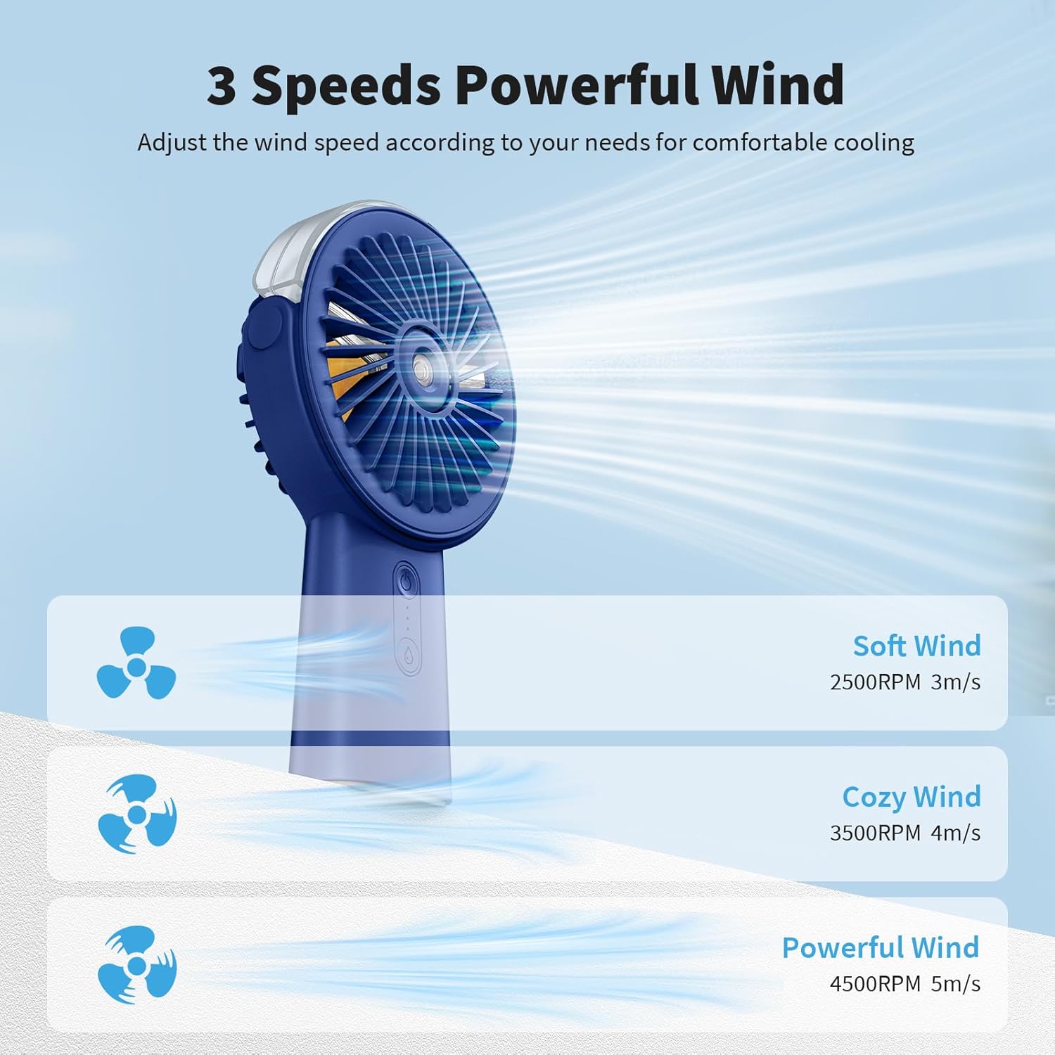 Handheld and Desk 2-IN-1: Thanks to the base design, you can used it as a handheld mister fan when outdoor and a mini desk fan on a flat table in the office. Anti-slip mat at the bottom of the base to keep it stable