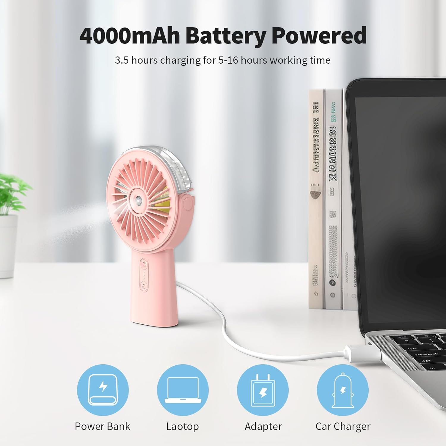 Portable Misting Fan, Misting Fan Portable Fan with Mist, 4000mAh Rechargeable Handheld Fan Battery Operated Water Spray Mister Fan, Small Personal Hand Held Fan Power Bank for Travel Men Women