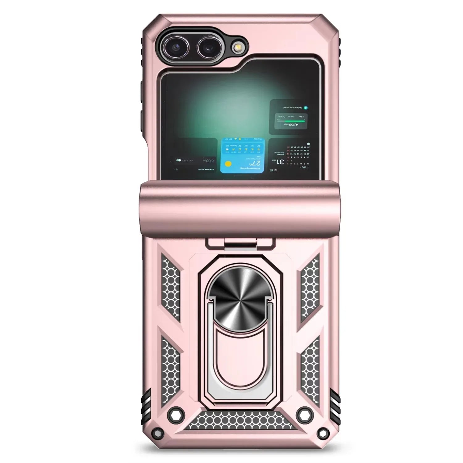 This rugged Samsung Galaxy Z Flip 7 phone case combines military-grade shockproof protection with a practical ring buckle bracket, allowing for a secure grip and versatile stand usage.