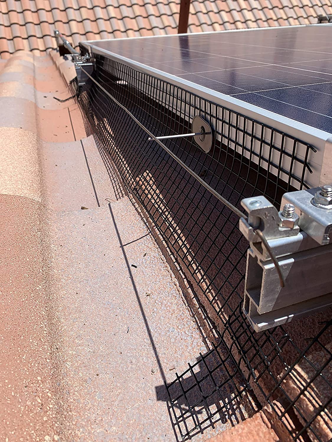 Our 20cm x 30m solar panel bird mesh made of PVC-coated steel. Removable and no drilling required. It is designed to keep birds and critters away and block them from nesting under your solar panels.
