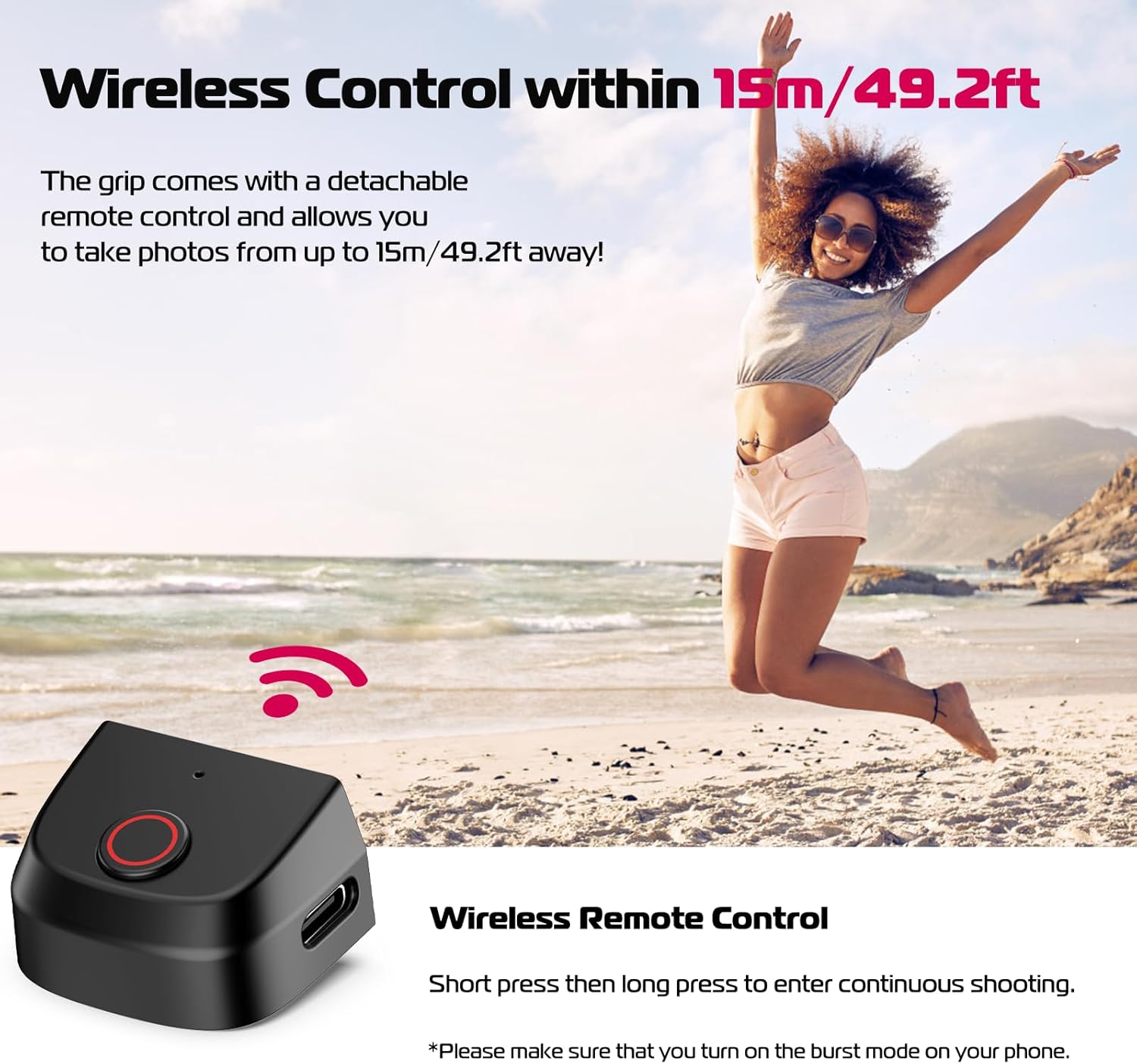 Detachable Wireless Remote Control - equipped with a detachable 15m/49.2ft wireless remote control, compatible with iOS and Android systems, and can be easily connected to your smartphone without downloading an app