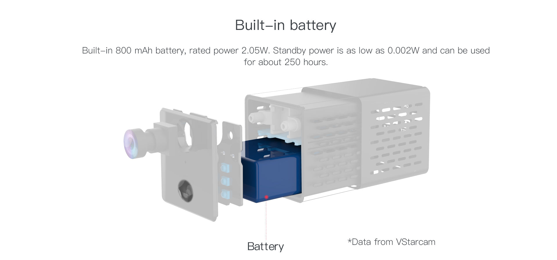 [ 800mAh Battery ] Compared to other brand camera, VStarcam CB73 camera is built-in 800mAh rechargeable battery, with one time full charge the record time can be reach up to 6 hours. USB power interface. Standby power is as low as 0.002W, Standby mode can last about 240 hours (about 10 days) each fully charging .