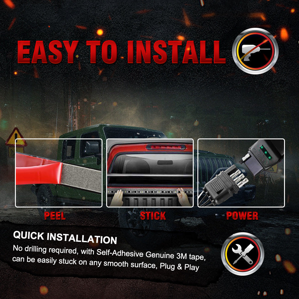 Simple Install: Easy "No Drill" mounting style, place it on your truck with at least 60" tailgate clearance that the tough-as nails 50lb-rated adhesive tape will not fall off! Then Plug and Play with using our 4-pin tow connector for quick connection.